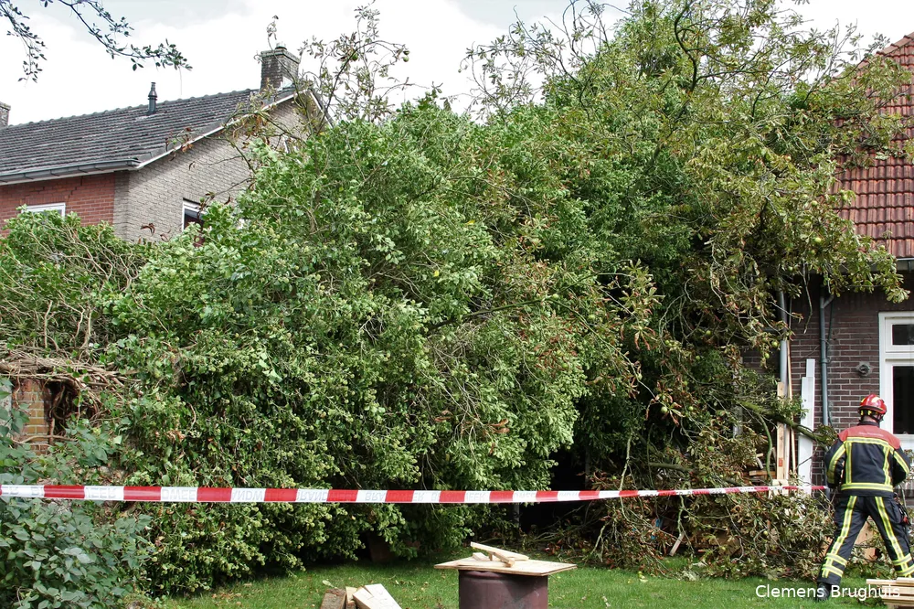 De brandweer heeft het perceel rondom met lint afgezet, maar de eigenaar moet verder zelf de boom verwijderen. Hoe groot de schade is, valt op dit moment lastig in te schatten.