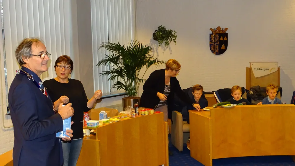 Dat is wat 22 kinderen uit groep 3 van de Mariaschool uit Reutum vanmorgen hebben gedaan. In de raadszaal van Tubbergen gaven zij samen met burgemeester Stegers en wethouder De Witte het goede voorbeeld in de week van het Nationaal Schoolontbijt.