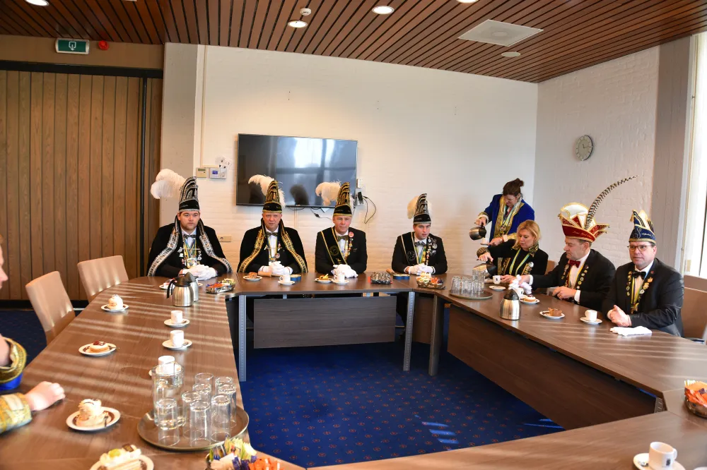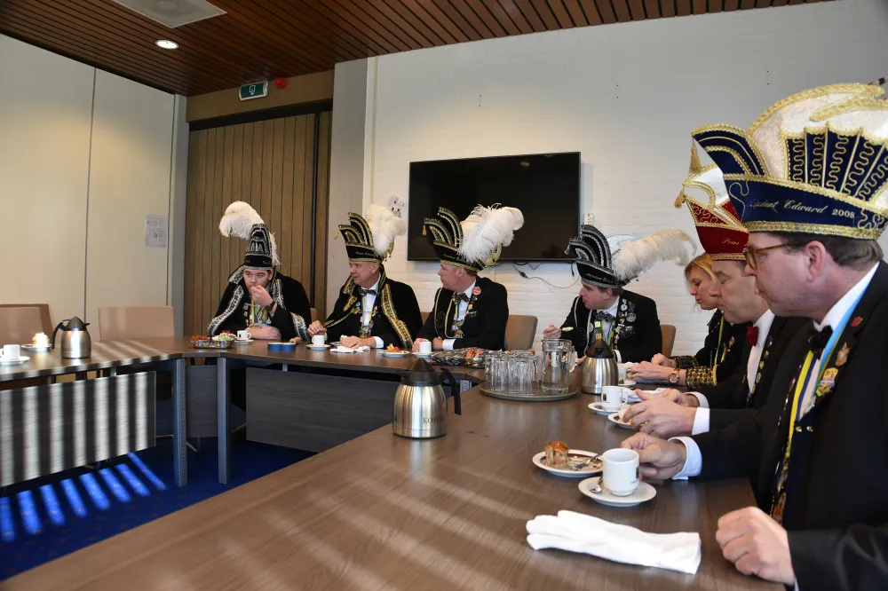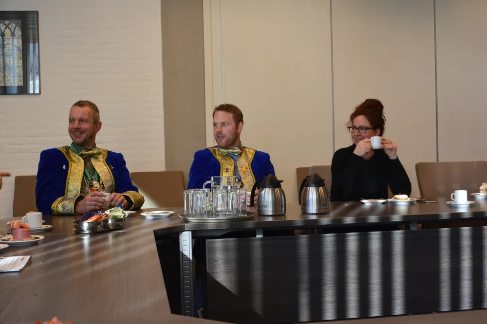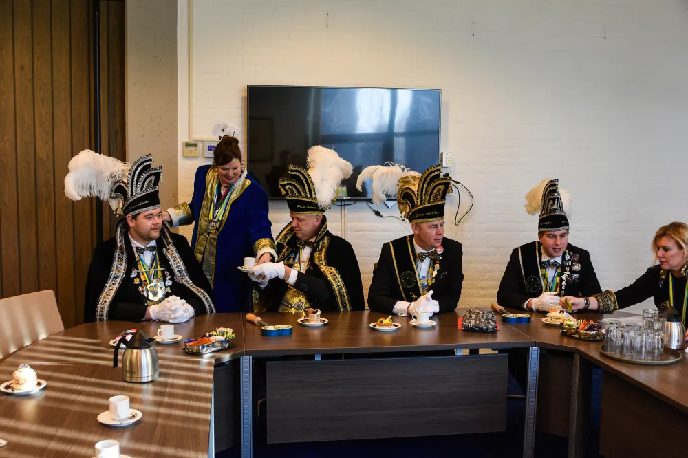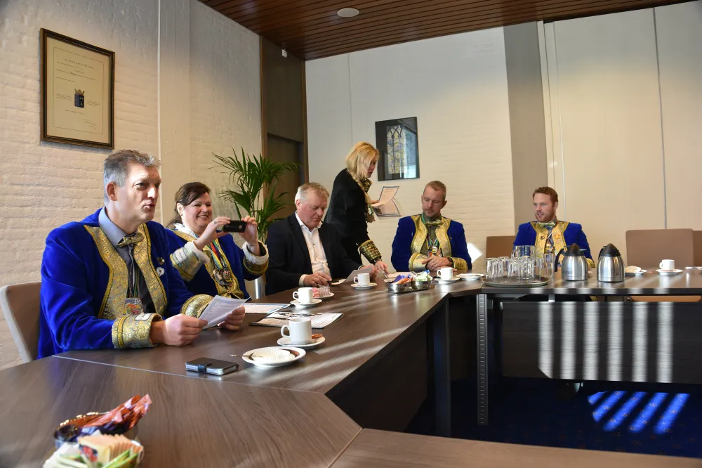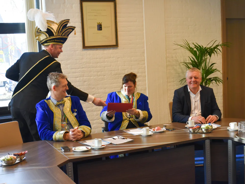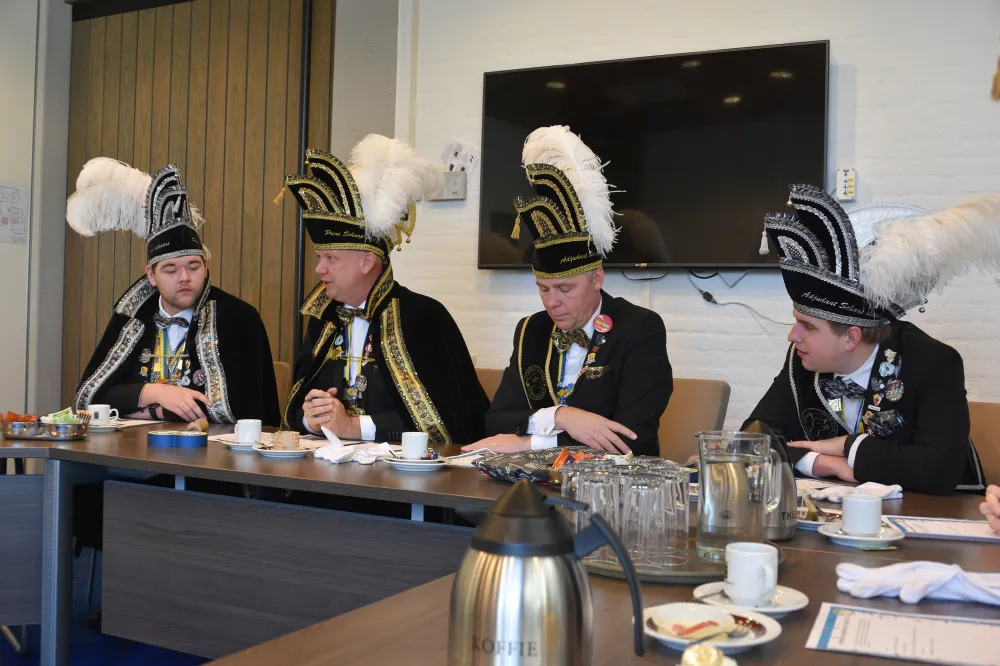 De wekelijkse collegevergadering werd vanmorgen geleid door sleutelprins Marco, adjudant Jeroen, jeugdprins Jesse en jeugdadjudant Jasper van de Schaop'nböll'kes uit Tubbergen.