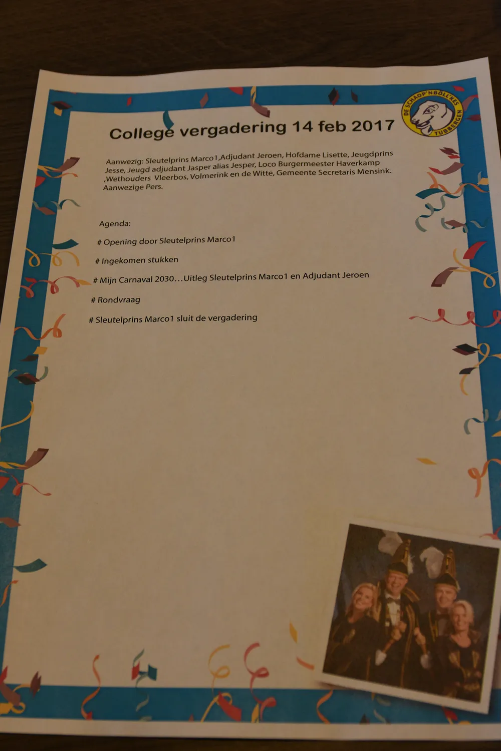 Hoofdthema van de vergadering wasMijn Carnaval 2030. Wat is er nodig om ervoor te zorgen dat het carnaval ook in 2030 nog springlevend is? Volgens de sleutelprins is een wethouder van carnaval daarvoor een eerste vereiste. Door het bijzondere college werd vervolgens unaniem besloten om deze wethouder ter plekke te benoemen in de persoon van Roy de Witte.