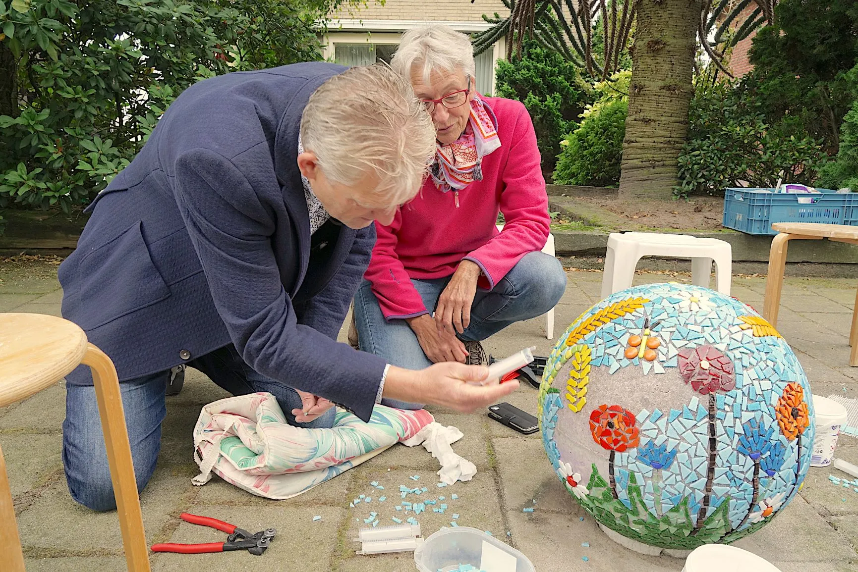 Het initiatief is tot stand gekomen door buurtbewoonster Mariët Derkman. “De bollen werden vaak over het hoofd gezien omdat ze dezelfde kleur hebben als de stoeptegels. Op een dag bedacht ik ineens om ze te gaan mozaïeken en kijk eens wat een mooi resultaat!”, vertelt ze. Om het gewenste resultaat te behalen heeft de buurtbewoner een cursus mozaïeken gevolgd. “Ik had één doel en dat was weer met elkaar in contact komen na zo’n jaar als deze. En dit doel hebben we zeker met 150 procent gehaald.”