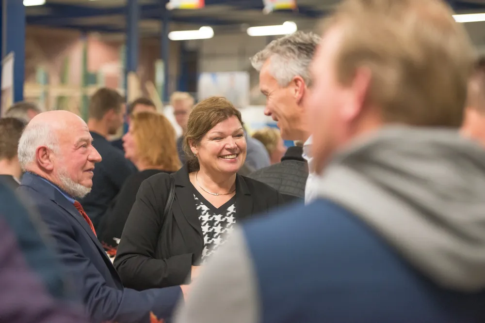 Om te onderstrepen hoe belangrijk het is dat jonge mensen kiezen voor een vak in de bouw, zaten veel prominenten in de grote praktijkhal van het opleidingsbedrijf van Bouwmensen Twente in Almelo tijdens het diplomafeest. Zoals burgemeester Haverkamp van de gemeente Tubbergen, waar heel veel bouwondernemingen en bouw gerelateerde bedrijven actief zijn. Naast haar zat collega Wanink uit het Duitse Itterbeck, woonplaats van tegelzetter Wilhelm Scholten (meervoudig NK, brons op de EK en een 4e plek op de WK).