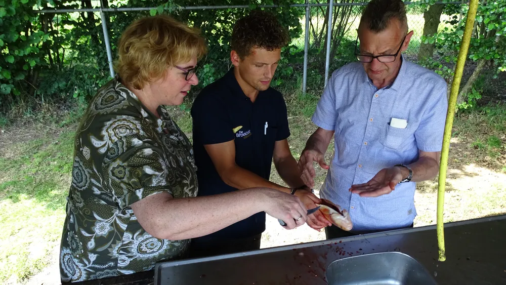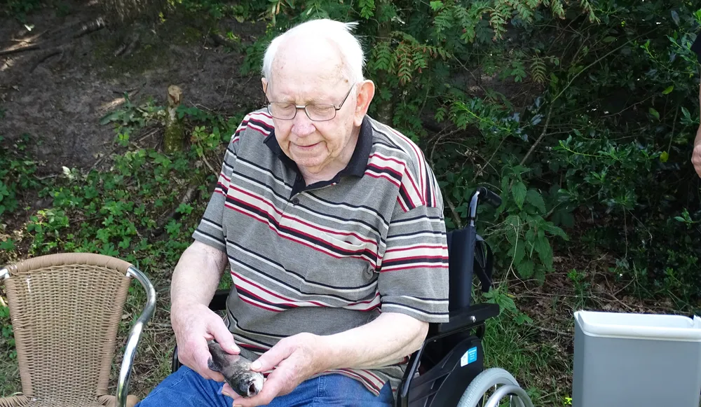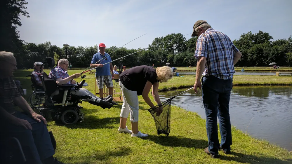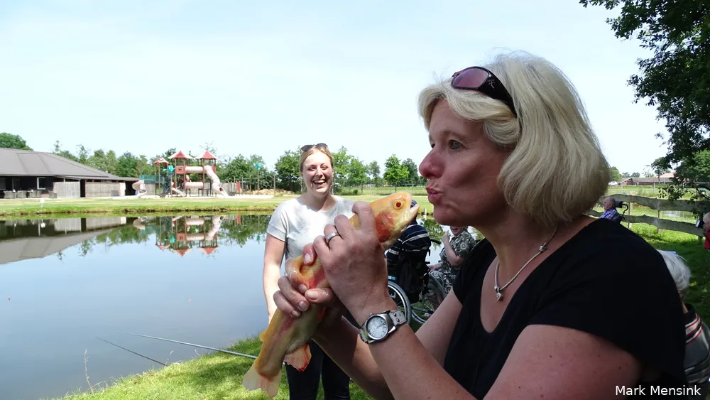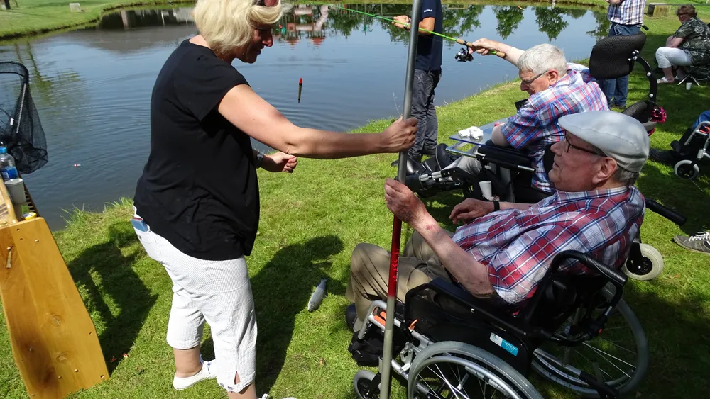 Van 14.00 uur tot 16.00 uur hebben de deelnemers aan de vissenjacht zoveel mogelijk forel gevangen. Hoewel er in het eerste uur geen enkele vis op het droge kwam, verliep het daarna een stuk vlotter en raakten de manden steeds voller. De ene dobber na de andere ging onder water, met als eindresultaat dat er een tiental vissen - waaronder 2 goudforellen - schoongemaakt moesten worden. Voor vrijwilliger Nicole Gringhuis-Rekers was het geen enkele moeite. Zichtbaar genoot ze van de tijd met haar vader, die ze begeleidde tijdens het uitje. "Met deze activiteit komen wij tegemoet aan een vraag van enkele heren onder de bewoners", zegt activiteitenbegeleidster Maureen Ruinemans die samen met Elsemiek Krabbe de leiding had. "Dat past ook in ons beleid. Bewoners kunnen zelf aangeven wat ze graag willen en als het maar even kan wordt het geregeld. We hebben sinds de ingebruikname al vaker wensen in vervulling kunnen laten gaan." Maureen gaat de visfilets mee naar huis nemen om ze er te roken. Komende maandag zal zij de panklare hapjes weer meenemen naar Erve Mensman, waar ze vast gretig aftrek zullen vinden.