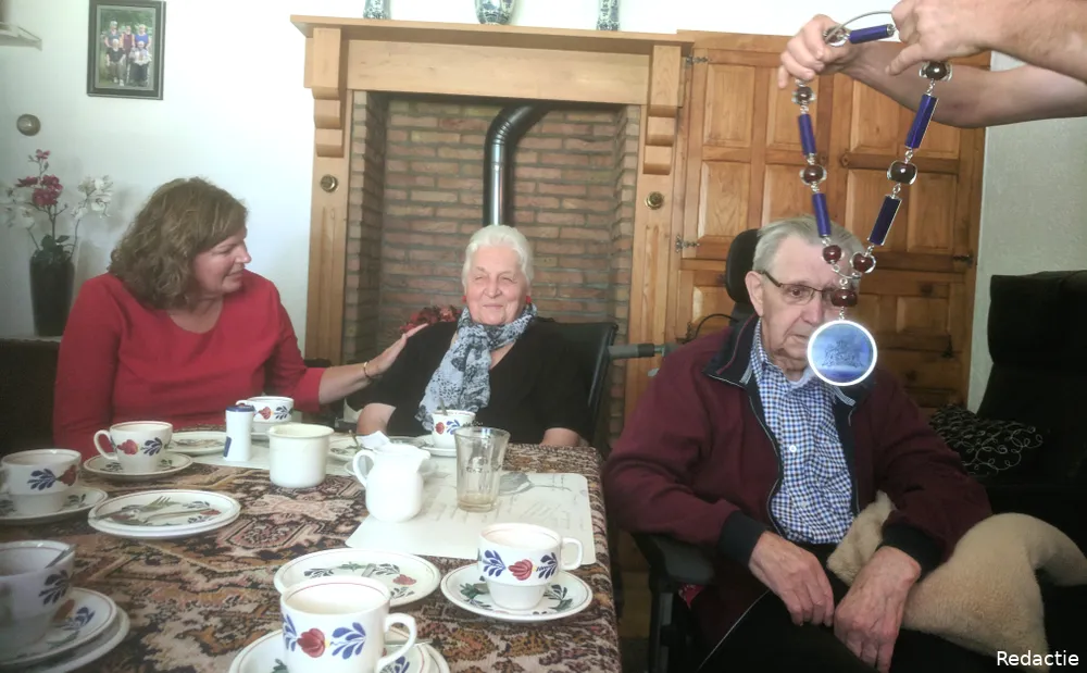 Toen burgemeester Wilmien Haverkamp-Wenker afgelopen week de officiële felicitaties overbracht, was er opnieuw reden om terug te blikken en vroegere tijden te herleven. Op een gegeven moment werd het daarbij zo informeel dat zelfs haar glazen ambtsketen bij het oudere paar en hun directe familieleden (3 dochter en schoonzoon Henny Grootelaar) omgehangen werd, terwijl de burgermoeder lachend toekeek.