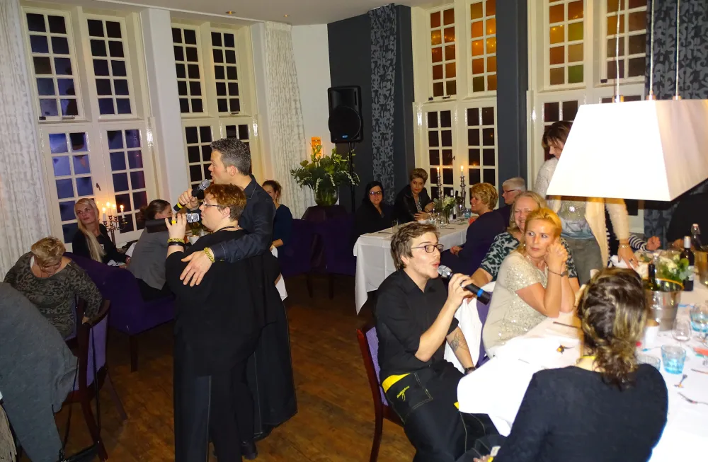 Zo'n 70 vriendinnen, buurvrouwen, teamgenoten en familieleden genoten er bij 't Oale Roadhoes van een sfeervol diner, waarbij de bediening in handen was van De Zingende Obers. Naast hun muzikale inbreng verloten ze ook op ludieke wijze een aantal cadeaus. Zo krijgen 2 gelukkige dames binnenkort een dagje lang de sleutels van een blitse terreinwagen.