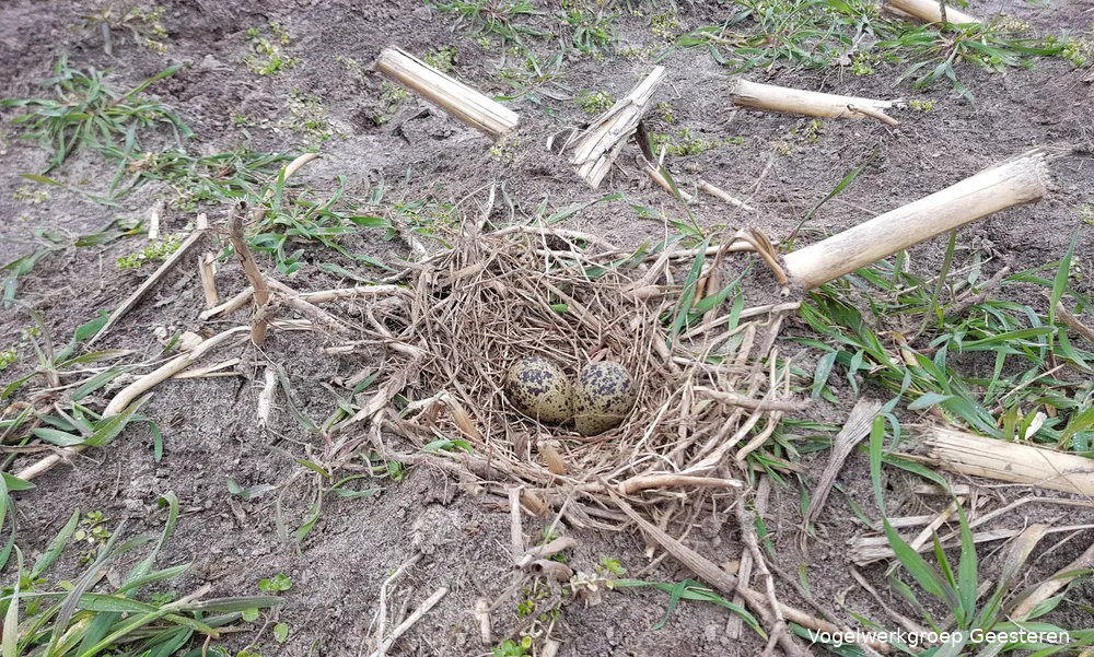 Het nest met 2 eieren ligt in het zoekgebied nabij de Weitemanslanden en is voorzien van 2 stokken, zodat de landbouwers met hun machines het nest kunnen besparen. "Geweldig om te horen dat de leden van de LTO graag hun medewerking hieraan verlenen; grote klasse", vertelt Hennie Schröder van Vogelwerkgroep Geesteren.