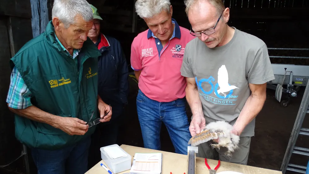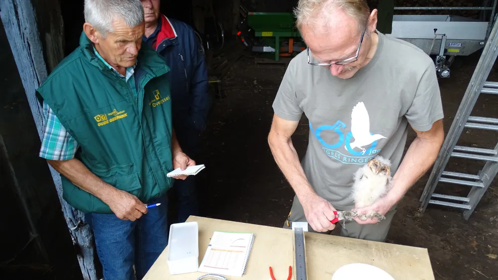 Johan Drop en de mannen van Vogelwerkgroep Geesteren zijn in de zomerperiode haast dagelijks op pad om ergens in voornamelijk Noordoost-Twente jonge vogels te ringen. "Met name kerkuilen, maar zeker ook bosuilen en bijvoorbeeld torenvalkjes. Die worden bekeken op algehele gezondheid. Daarnaast wordt het gewicht en vleugelgrootte bepaald en bij benadering ook de leeftijd", legt Johan uit. De voor zijn vrijwilligerswerk alsvogelaar koninklijk onderscheidenFleringer stuurt deze informatie, en ook de locatie van het desbetreffende nestje, door naar onderzoekers van Wageningen UR. Daarmee kunnen bijvoorbeeld de vliegroutes of totale populatie worden ingeschat.