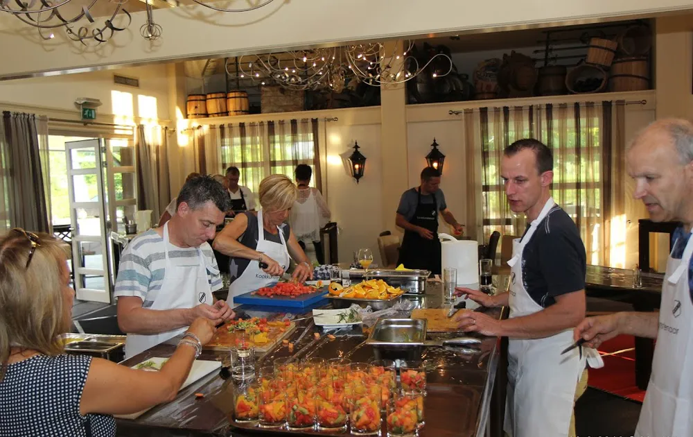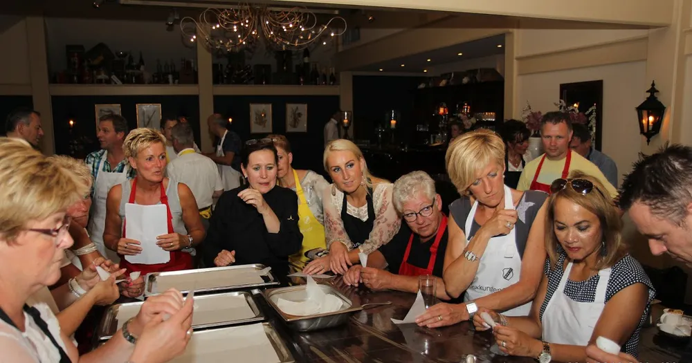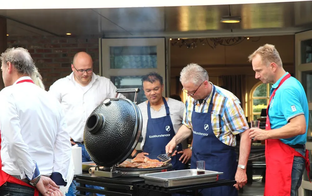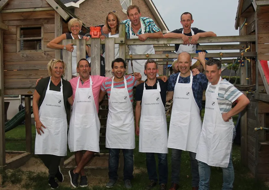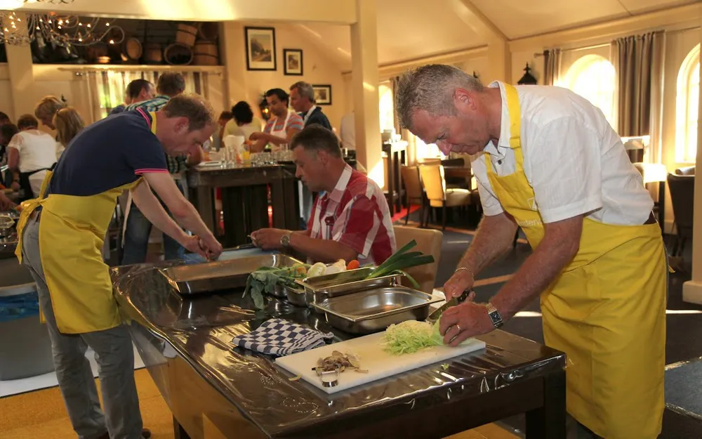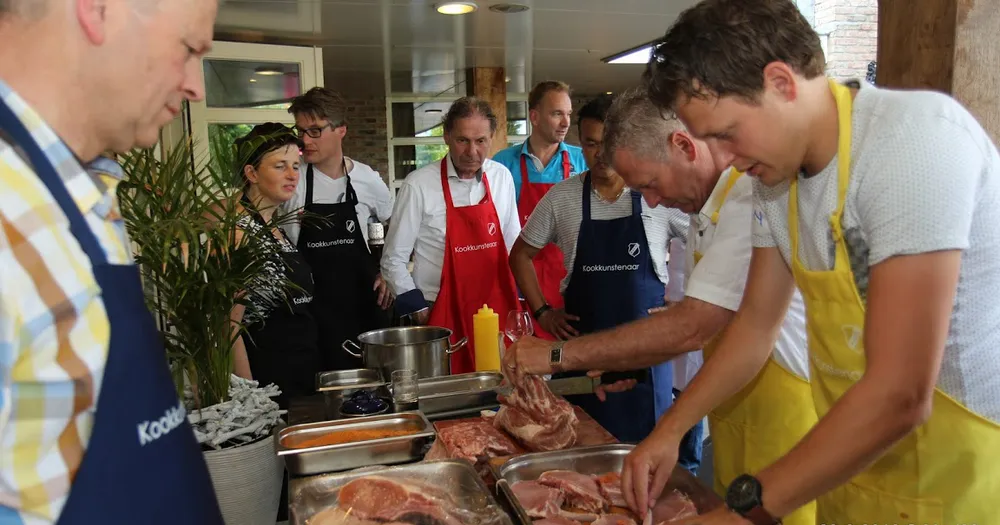 Onder leiding van Benedicte Groothuis-Hoitink van Kookstudio Mariaparochie en team van Kampkuiper ontvingen de sponsoren, nadat ze in groepen waren verdeeld, instructies om een 3-gangen diner voor te bereiden. Ze hadden hun Franse woordenboek misschien maar beter mee kunnen nemen. Mise en place (voorbereidende werkzaamheden treffen) en au bain-marie (in een waterbad plaatsen van een kom met gerechten), zo maar 2 van de niet-alledaagse termen die tijdens de sponsorbijeenkomst vielen. Toch gingen de aanwezigen fanatiek aan de slag om de rettich te snijden, de avocado te pureren en de 'boernjongs' op smaak te krijgen. Uiteraard hielp chef-kok Fons om het prachtige stuk varkensvlees te grillen en was een team bezig om het bestek, servies en de glazen te poleren.