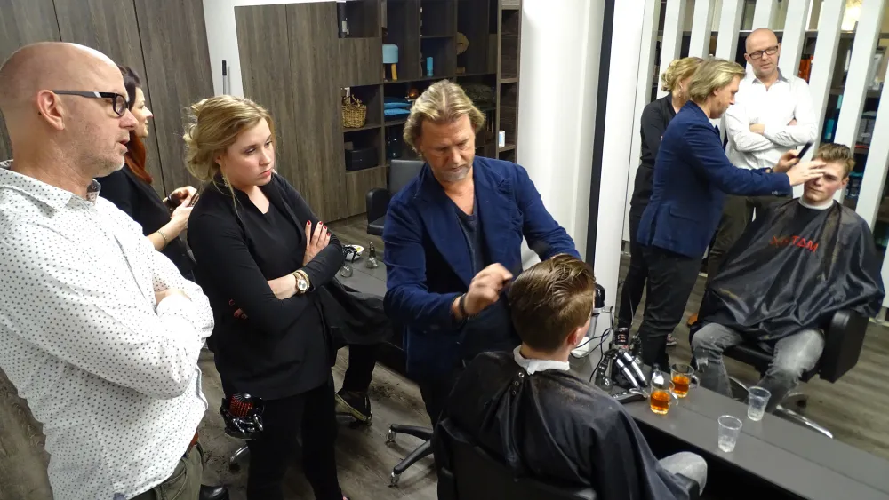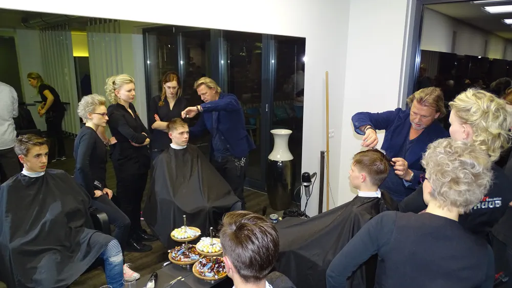 "Een tondeuse gebruiken kan haast iedereen en die strakke voetbalkapsels kennen we onderhand wel. Het moet steeds korter, tot op de hoofdhuid. En dan? Wat wordt het dan? Verder kun je gewoon niet. Iemand écht een persoonlijk kapsel geven, op maat gemaakt dus, da's totaal andere koek", benadrukt Steggink met klem. De beter als Kapper Huub bekend staande Fleringer windt er duidelijk geen doekjes om. "Meestal, tijdens een dergelijke avond, kiezen we ervoor om vrouwen onder handen te nemen. Die een ander kapsel te geven. Vandaag zijn de mannen aan de beurt, want ook daarin veranderen dingen heel snel."