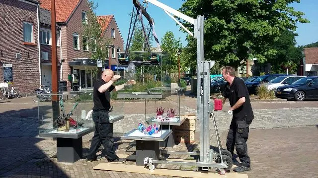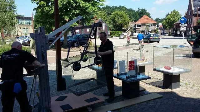 Vaklui van Glass Solutions/Almeline kwamen onlangs langs om de 4 glazen kappen, van de vitrines op het Raadhuisplein in Tubbergen, op te lichten en het geëxposeerde glaswerk te vervangen. Dat werd gedaan door vrijwilligers en bestuursleden van Glasrijk.
