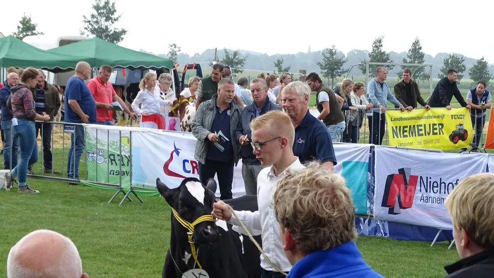 Was het voetbalveld van 'n Kaps in Tubbergen tijdens eerdere edities nog het strijdtoneel, dit jaar moest noodgedwongen uitgeweken worden naar een Reutummer weide. "Vooraf hadden zich 102 deelnemers aangemeld, van vele bedrijven. Door omstandigheden, zoals veterinaire problemen en anderszins, zijn er vandaag een dikke 80 ter tonele verschenen. Daarmee is dit toch wel de grootste jongveekeuring van Nederland", legt Fons Geerink uit.