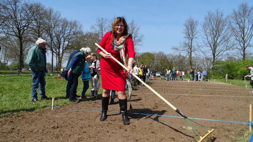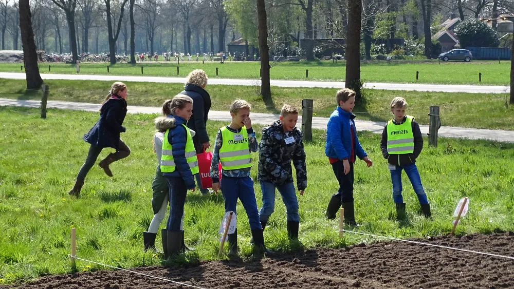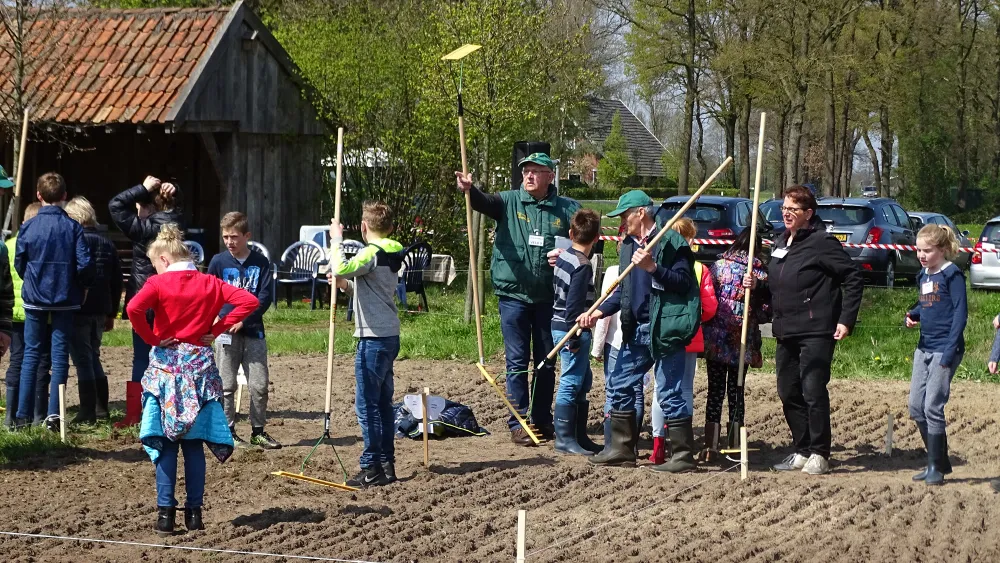 Zaaien en harken op het land. Gisteren waren 60 kinderen van de Geesterense basisschool 'groene vingers' aan het ontwikkelen in het buitengebied van Geesteren. De bedoeling is om binnen 5 jaar alle lagere scholen van de 4 gemeenten in Noordoost Twente (Dinkelland, Tubbergen, Losser en Oldenzaal) bij het project te betrekken. "De grote kracht van dit uniek project is dat de jeugd zelf aan het werk moet. Ze gaan zelf zaaien en inharken", legt Theo Lohuis uit. "Jeugd meer betrekken bij de natuur, zoals wij dat vroeger heel gewoon vonden. Dat is het grotere doel hiervan. Ze moeten eigenlijk gewoon zelf zien wat er allemaal leeft en kruipt, zodat zij die geleerde informatie ook weer verder kunnen doorgeven aan anderen."