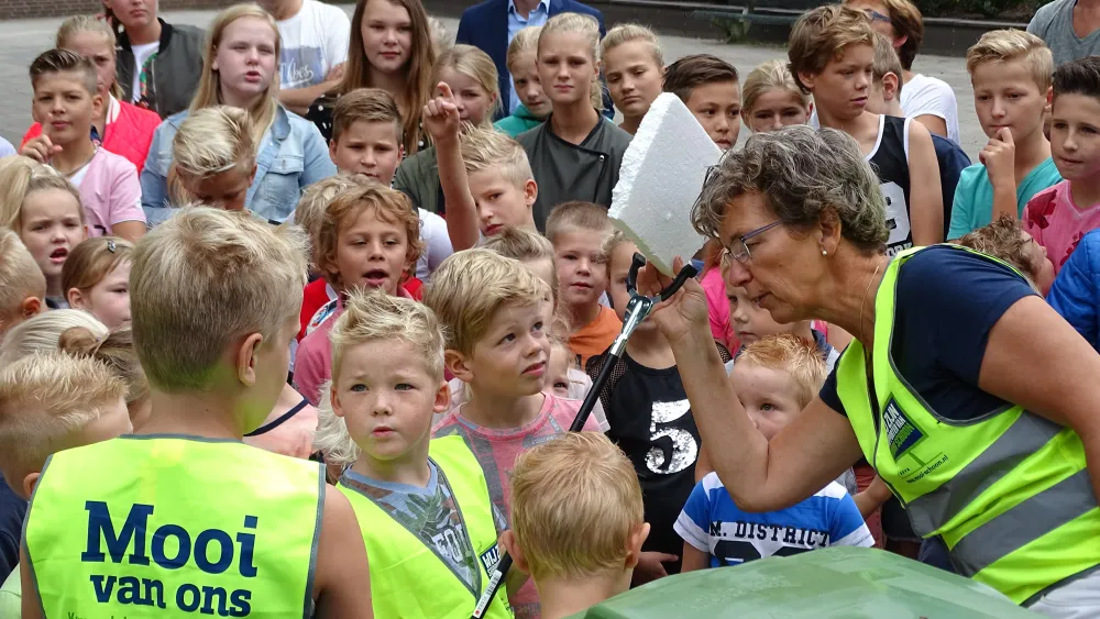 De wethouder heeft de kennis van de leerlingen getest om te zien of zij bijvoorbeeld weten in welke container een chipszak hoort of hoe lang het duurt voordat een blikje verteerd is. "Ik sta er van te kijken dat jullie al zoveel kennis hebben over afval en zwerfvuil. Dat jullie zelfs weten dat een chipszak bij het restafval hoort", aldus Vleerbos. Bij het scheiden van de afvalstoffen kreeg hij hulp van Mika Flinkers (groep 2), David Frieling (groep 3), Guus Scholten (groep 4/5) en Kees Groothuis (groep 6).