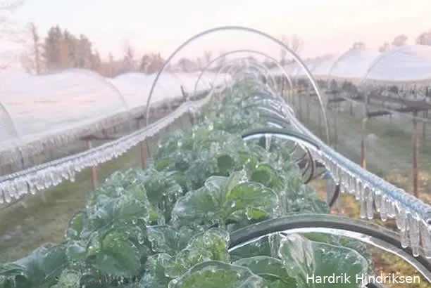 's Nachts gaat regelmatig het alarm af bij huize Hindriksen. Dan gaat het niet om de gewone wekker, maar om een thermometer die laat weten dat het vriespunt nadert. Tijd om naar buiten te gaan voor Hardrik, die een sproeier aanzet om de aardbeienplanten te beregenen. En het lijkt tegenstrijdig, maar juist bij die beregening vormt zich eenijslaagjedat als een soort isolatiemateriaal werkt.