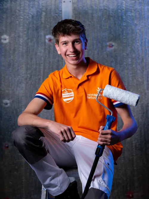 Stef Olimulder, schilder (in samenwerking met Schildersvakopleiding Hengelo), 17 jaar uit Langeveen. “Gewoon door blijven trainen en gaan voor het hoogst haalbare! Ik heb zelfs thuis een ruimte ingericht om mijn schildertechnieken verder te verbeteren, met als doel om de beste van de wereld te worden.”