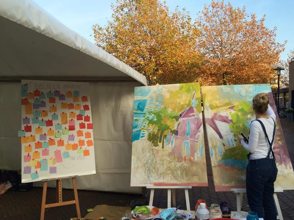 De stand van Tubbergen Bruist stond midden in het centrum en trok bekijks met het schilderwerk van Marieke Bekke uit Albergen. Marieke stond ter plekke de ideeën te schilderen waarover de leden van de projectgroep in dialoog gingen met de voorbijgangers. De hamvraag: hoe houden we samen Tubbergen bruisend en wat wens jij voor de toekomst van Tubbergen?