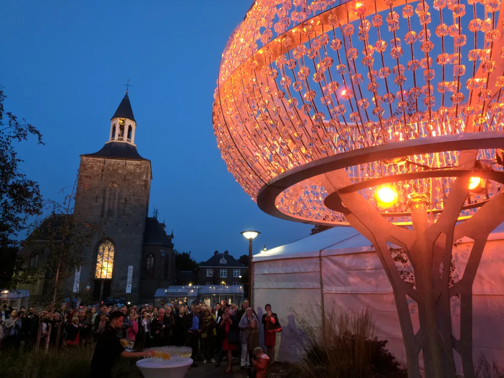 Net voor het gemeentehuis is vanavond een eerste kunstobject, bestaande uit honderden glinsterende en aaneengeregen glassteentjes, van de Glinstering onthult. Hiermee werd tegelijkertijd een startschot gegeven voor Glasrijk Tubbergen, het jaarlijkse glasfestival.