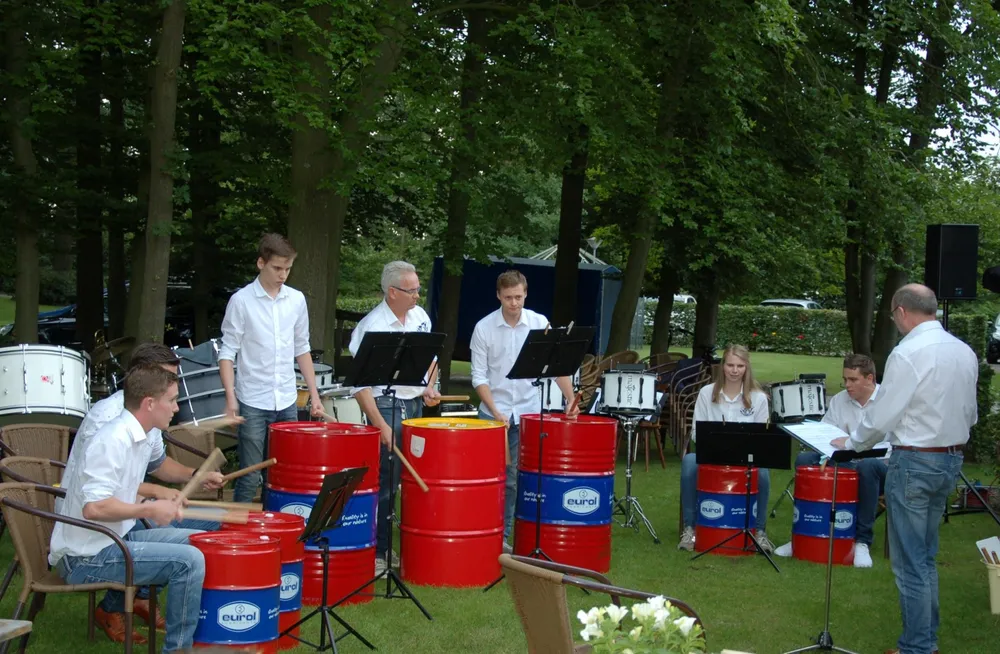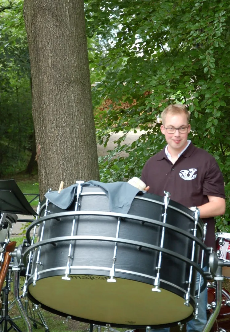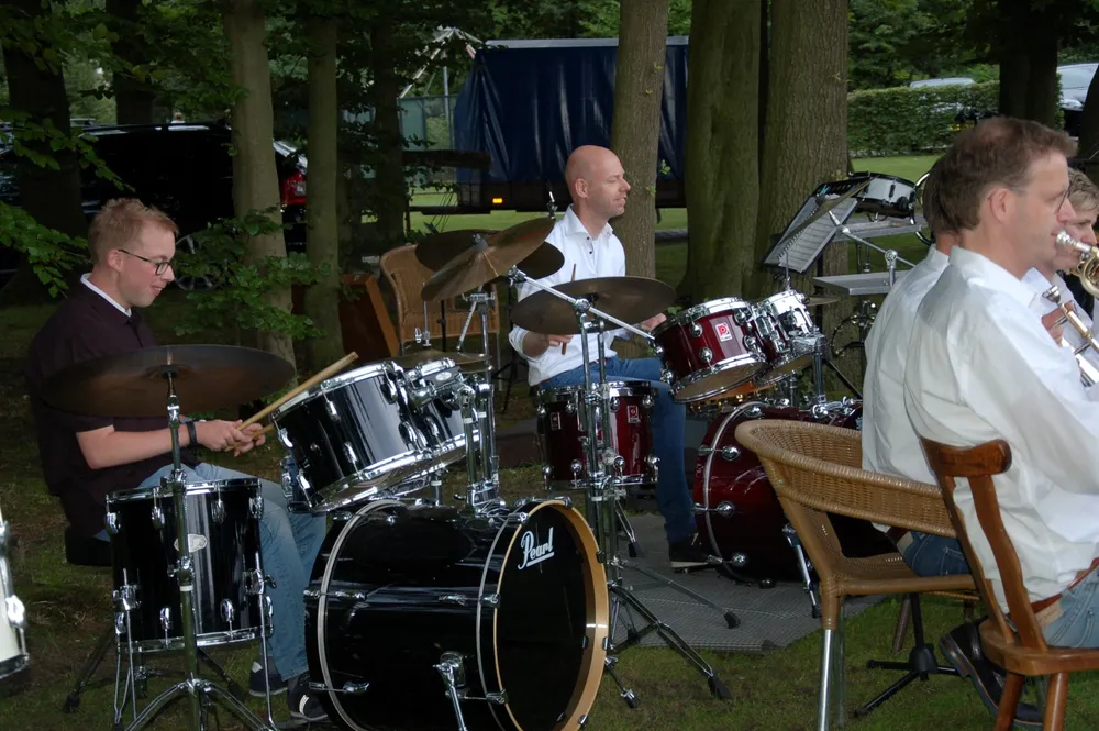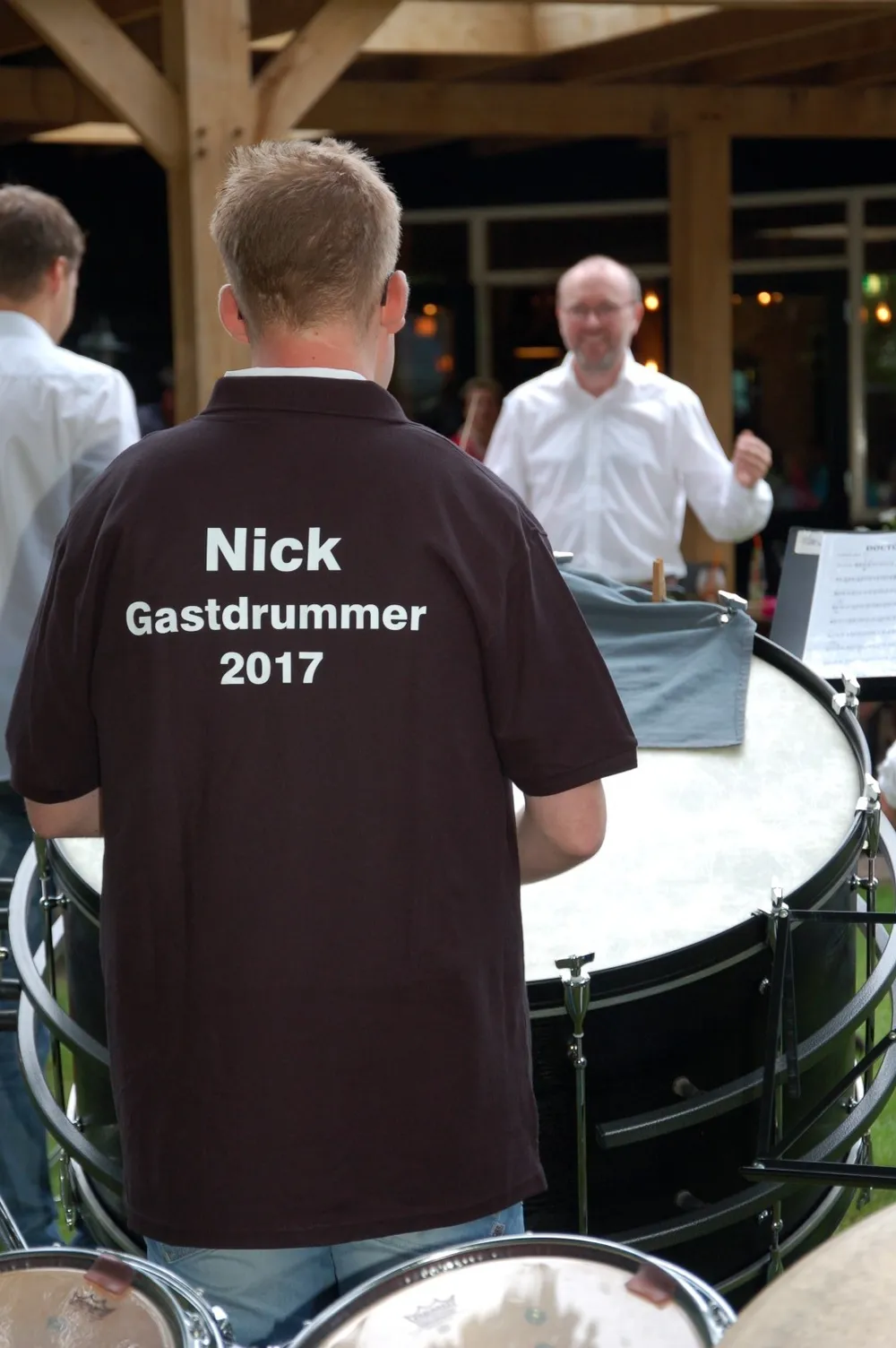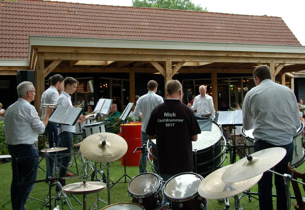 Daarop was het de beurt aan de slagwerkgroep, en werd ook de gastmuzikant van de dag geïntroduceerd. Nick had gereageerd op een oproep van de vereniging en had zich aangemeld om mee te spelen, had een paar keer mee gerepeteerd en leek er helemaal klaar voor. Hij begeleidde de slagwerkgroep in de eerste twee werken, en bewees over een uitstekend gevoel voor ritmiek te beschikken. Vol overtuiging en enthousiasme sloeg hij zijn partij op de grote trom mee. Het speelplezier straalde er vanaf en ook het publiek en overige muzikanten genoten van zoveel spelplezier. De slagwerkgroep, geleid door Jaap Hazewinkel, vervolgde haar programma met een stuk waarin op olievaten gedrumd werd en een werk waarbij met op maat afgezaagde plastic buizen melodie en ritmiek knap gecombineerd werd.