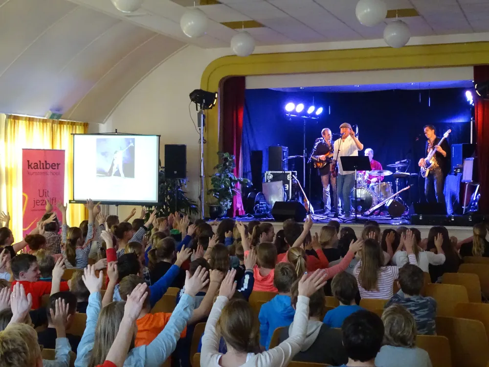 In een eigentijds en interactief popconcert namen de popdocenten van Kaliber Kunstenschool vanmorgen vroeg enkele klassen met Tubbergse leerlingen mee door de geschiedenis van de popmuziek. Diverse stijlen van blues, soul, disco, R&B en grunge tot en met jazz, metal en rock werden live gespeeld en - meestal op hilarische wijze - toegelicht.