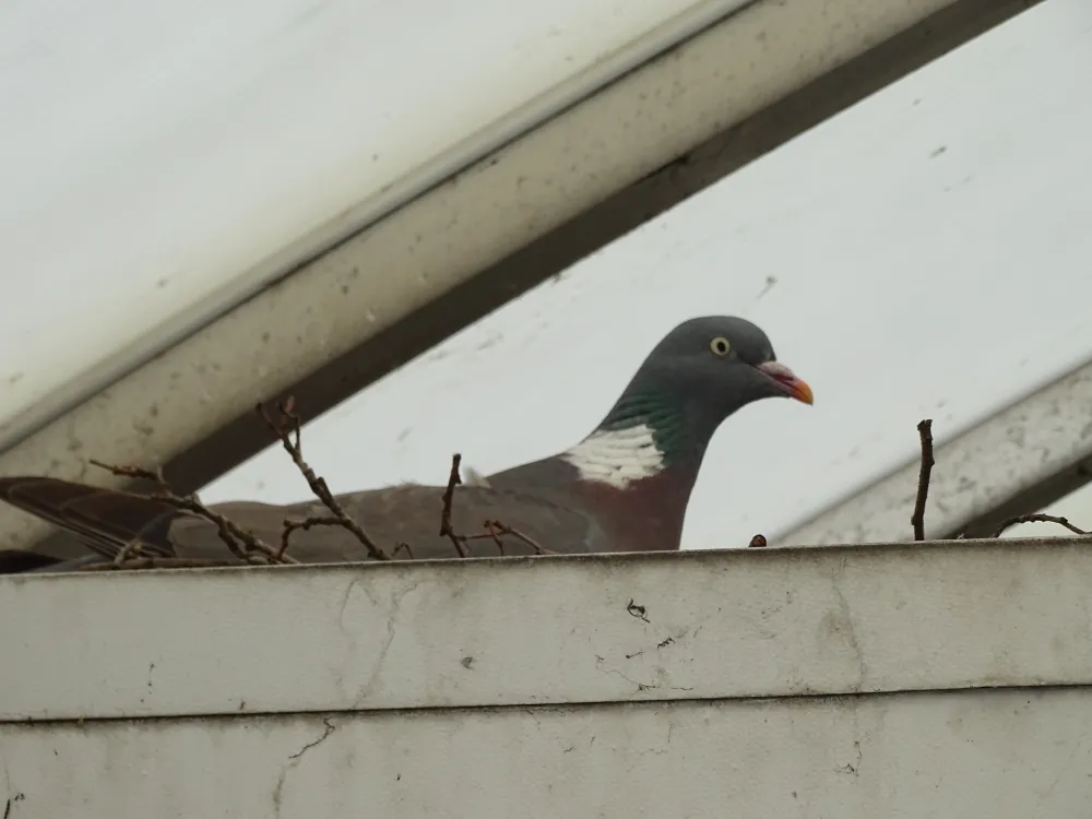 Het beestje hapt letterlijk naar adem in z'n nestje. Toch blijft ze zitten waar ze zit, tussen de takjes. Schröder: "De duif is absoluut niet bang en lijkt inmiddels volledig gewend te zijn aan de frequente douche."
