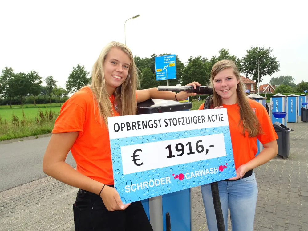 Tijdens de ‘Week van de PIN’ stonden enkele meiden klaar om auto's te stofzuigen voor een goed doel. De beide initiatiefnemers, Thirza Lammerink en Lean Braakhuis, haalden hiermee het lieve sommetje van €1.916 op.