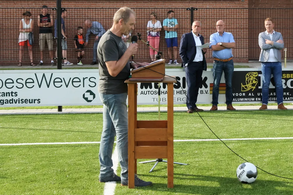 Na de speech van Jan Mensen nam wethouder Roy de Witte het woord en hij gaf aan respect te hebben voor wat een relatief kleine vereniging als VV Langeveen onder andere met de eigen werkzaamheden vanuit de gemeenschap allemaal voor elkaar heeft weten te boksen. Hij bekende vooraf bedenkingen te hebben gehad. "Ik moet het allemaal nog maar eens zien" ontviel hem toen, maar hij vond het eindresultaat fantastisch. Wel maakte hij met een knipoog een opmerking naar de genoemde 4 personen dat hij nog wel een mooi project voor de heren wist en keek daarbij naar het clubgebouw. In het publiek hoorde je instemmende geluiden; daar is misschien ook wel een taak voor de gemeente en Mijn Dorp 2030 weggelegd. Aansluitend op de toespraak van Roy de Witte gaf Gerard Oude Lansink (voorzitter van de WOT) ook de complimenten aan de VV Langeveen en refereerde nog aan de gloriejaren van de vereniging waarin ze veruit het sterkste eerste elftal in de gemeente Tubbergen hadden en sprak de hoop uit dat dit kunstgrasveld bij zal dragen aan nieuwe sportieve successen. Ook Gerard Avéres, voorzitter van Dorpsraad Langeveen, gaf aan zeer verheugd te zijn met het resultaat gerealiseerd door inspanningen vanuit de gehele gemeenschap Langeveen/Bruinehaar. Hij sprak de hoop uit dat Mijn Dorp 2030 nog veel meer gaat betekenen voor Langeveen/Bruinehaar en dat er inmiddels een werkgroep is opgericht. Avéres verwees ook nog even naar het clubgebouw, misschien ook wel een mooi project dat onder ander met de steun van Mijn Dorp 2030 opgepakt kan worden.