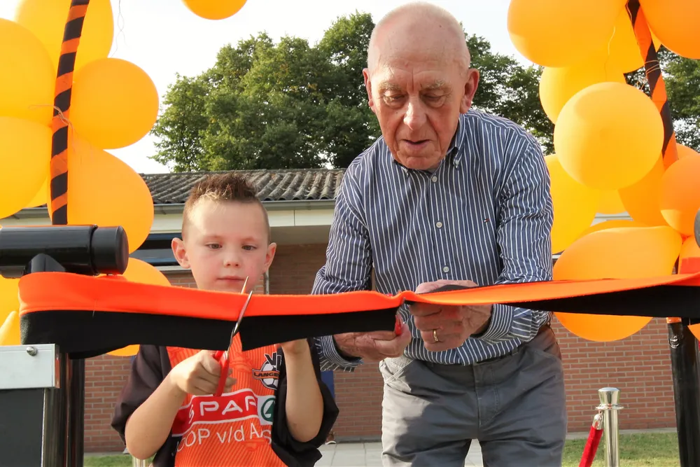 Na de toespraken was het eindelijk tijd voor de officiële openingshandelingen en hadden het oudste lid van de VV Langeveen, Johan Hagedoorn (al net zo lang lid als de vereniging bestaat), en het jongste actieve lid, Wessel Kuiphuis de eer het oranje/zwarte lint door te knippen waarmee het veld officieel geopend werd.