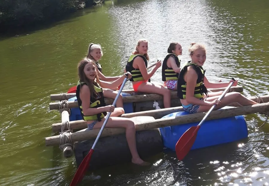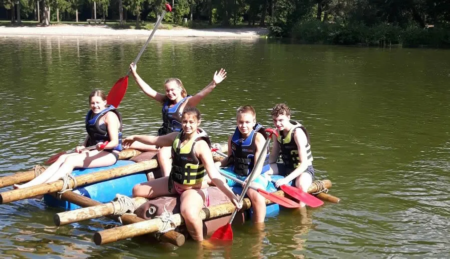 Zondagochtend ging, na een wat langere nachtrust, wederom om 07.45 uur de wekker. Na het ontbijt werd het doolhof-tikspel gespeeld. Toen de zon begon te schijnen werd er gezamenlijk naar de recreatieplas gewandeld voor een teambuildingsactiviteit: vlotten bouwen. Onder leiding van een instructeur werden er vlotten gebouwd met palen, touwen en tonnen. Mooi om te zien hoe de verschillende groepen samenwerkten en de vlotten vlot in elkaar hadden zitten en er vervolgens mee konden varen. De 2 jongste basketballertjes uit U8 mochten bij de instructeur in de kano en vaarden zo met de groepen mee. Na afloop van de activiteit gingen de zwemvesten uit en kon er worden gezwommen in het recreatiemeer. Eenmaal terug bij het 'Jolly Jumpers-huis' zijn alle spullen bij elkaar gezocht en werden de auto's weer ingepakt. Moe maar voldaan stapten de basketballers in de auto. Het weekend was alweer voorbij. Bij de sporthal stonden ouders, broertjes en zusjes al klaar om de kinderen op te halen.
