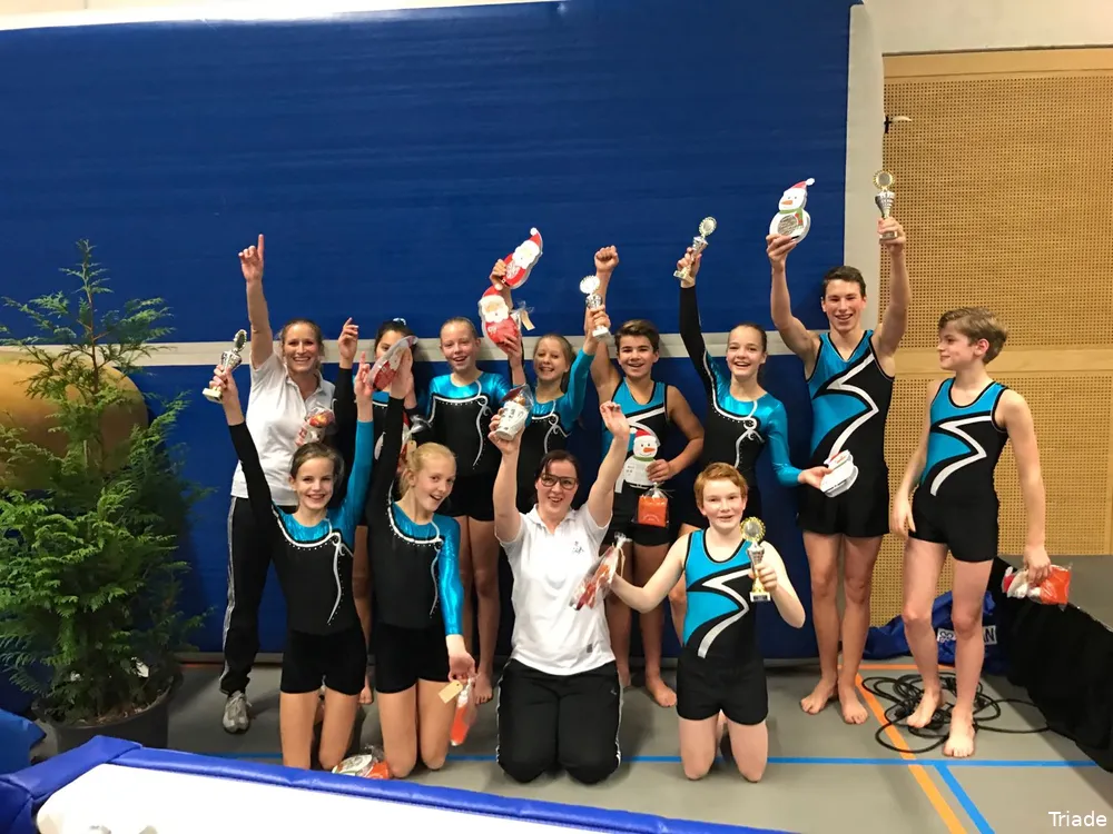 Op de onderdelen plank-pegasus, airtrack, minitramp en minitramp-tafel kreeg de mix-juniorengroep van gymnastiekvereniging Triade uit Almelo de hoofdprijs op A-niveau. Alleen op het onderdeel minitram-pegasus werd de ploeg, die vorig jaar op B-niveau ook al volop in de prijzen viel, tweede.