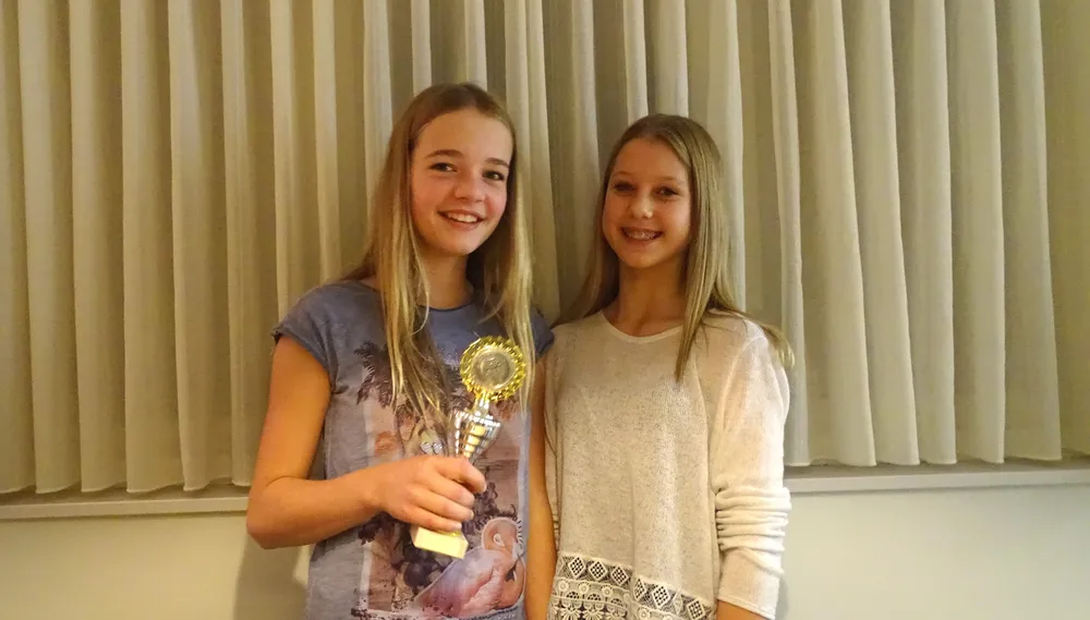 Mies Klumpers uit Albergen en Indy Letteboer uit Tubbergen, beide 13 jaar oud, doen aan groepsspringen. Deze gymnastische sport bestaat uit een aantal onderdelen. De bijzondere prestatie deden ze in groepsverband, met nog 8 anderen. "Hiervan mogen er per keer 9 meedoen", legt Indy uit. "Dus als er iemand geblesseerd is, kan 'ie die keer toekijken."