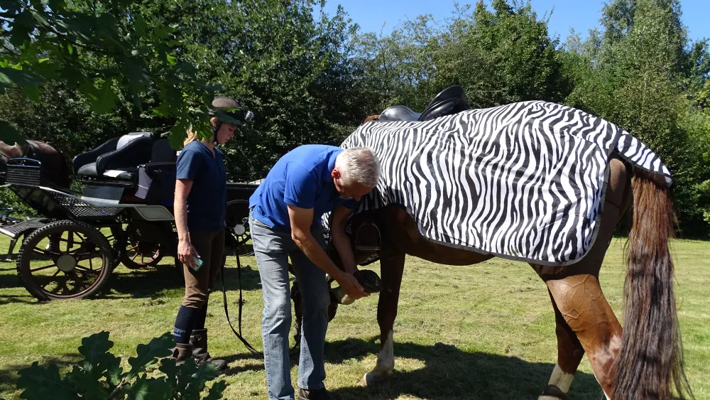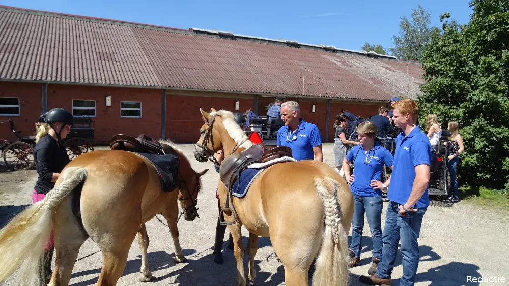 De zon staat hoog aan de hemel, voor mens en dier is het knap heet. Corné van der Bijl van Dierenartspraktijk Geesteren stiefelt niettemin onvermoeibaar van de ene imposante viervoeter naar de andere. "De meesten zijn goed getraind", constateert hij. "Echt maar een enkeling heeft nog een te hoge hartslag en moet wat langer rusten."