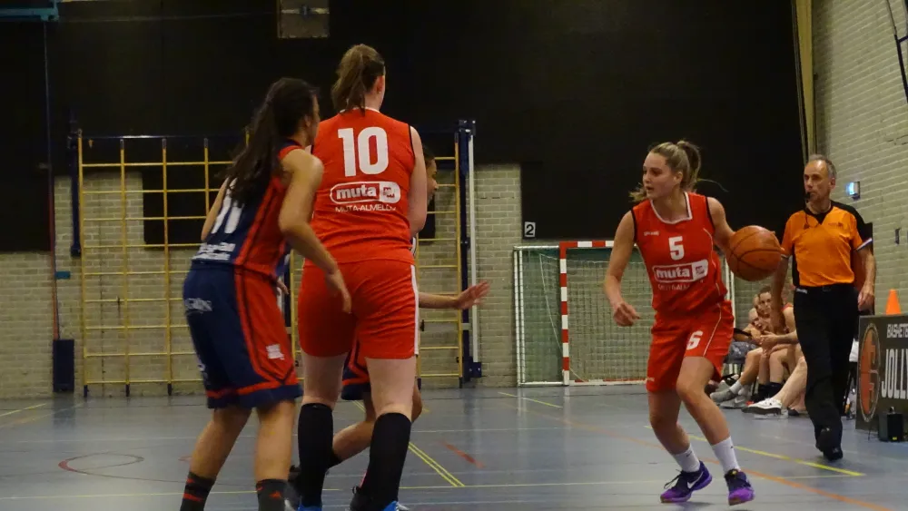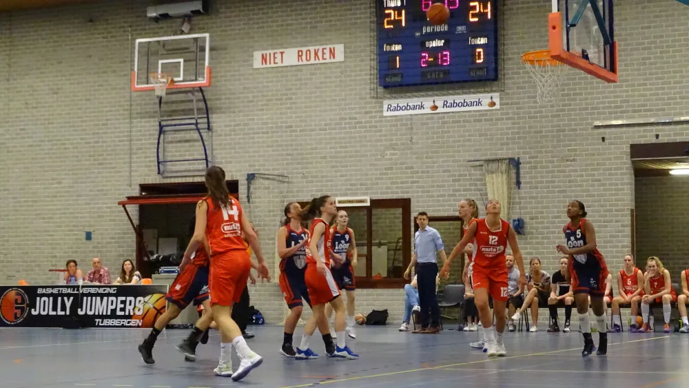 Vooraf leek het een kat in 't bakkie. Met 14 punten voorsprong uit een eerder treffen leek de Tubberger ploeg al bij voorbaat op rozen te zitten. Toch duurde het even alvorens de meiden van Jolly Jumpers onder 20 jaar helemaal in hun ritme kwamen. Maar toen ging het dan ook als vanzelf en - naar mate de pot vorderde - steeds beter. Met een fanatiek en tegelijkertijd gedecideerd coachende Mart Kieftenbeld op de bank, waarop hij overigens niet zo heel vaak plaatsneemt, sterspelers die aan een half woord genoeg hebben en sterke omschakelingen tussen aanvallende en verdedigende posities, kwamen de meiden uit Tubbergen nooit in de gevarenzone terecht. Vooral het laatste kwart was als om door een ringetje te halen.